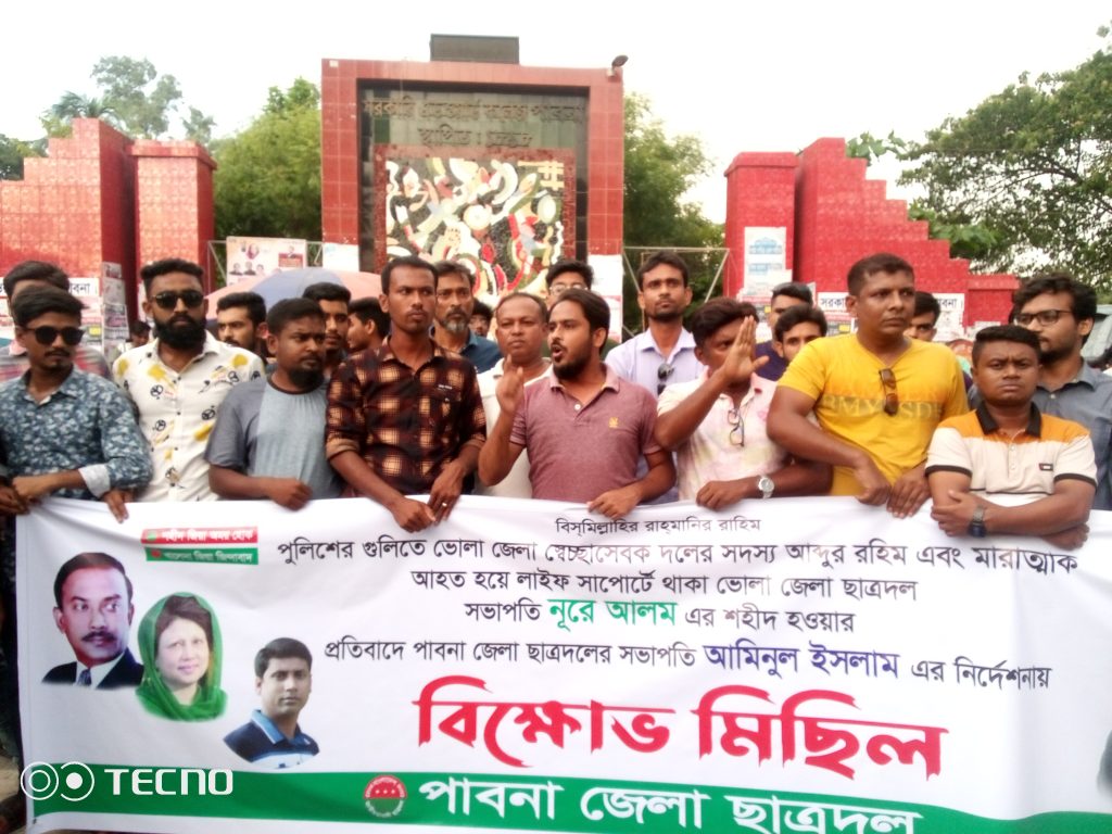 পুলিশের গুলিতে ভোলা জেলা স্বেচ্ছাসেবক দলের সদস্য আব্দুর রহিম এবং মারাত্মক আহত হয়ে লাইফ সাপোর্ট থাকা ভোলা জেলা ছাত্রদলের সভাপতি নুরে আলম হত্যার প্রতিবাদে পাবনা জেলা ছাত্রদলের সভাপতি আমিনুল ইসলাম এর নির্দেশশনায় বিক্ষোভ মিছিল অনুষ্ঠিত হয়। পাবনা সরকারি এডওয়ার্ড কলেজ বিশ্ববিদ্যালয়ের বিভিন্ন চত্বর ঘুরে এডওয়ার্ড কলেজ মুল ফটক গেট চত্বরে বিক্ষোভ মিছিল ও বক্তবের মাধ্যমে বিক্ষোভ সমাবেশ শেষ হয়।