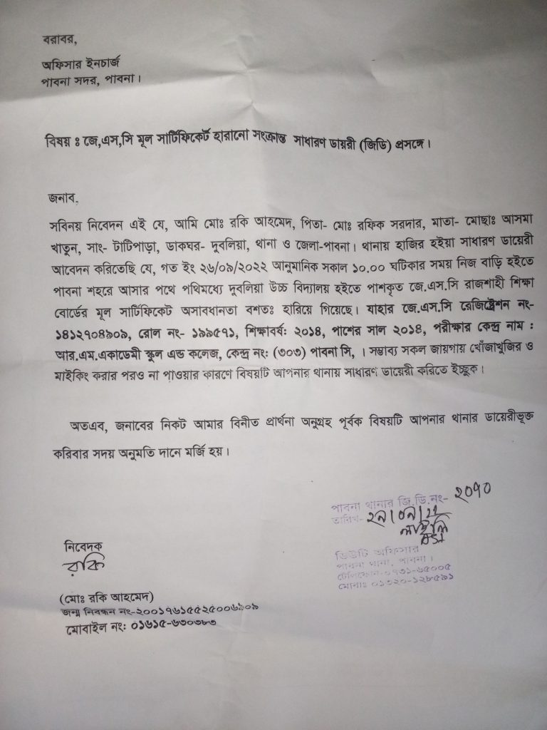 এ মর্মে পাবনা সদর থানায় জিডি নং-২০৭০, তারিখঃ ২৯/০৯/২০২২ইং।