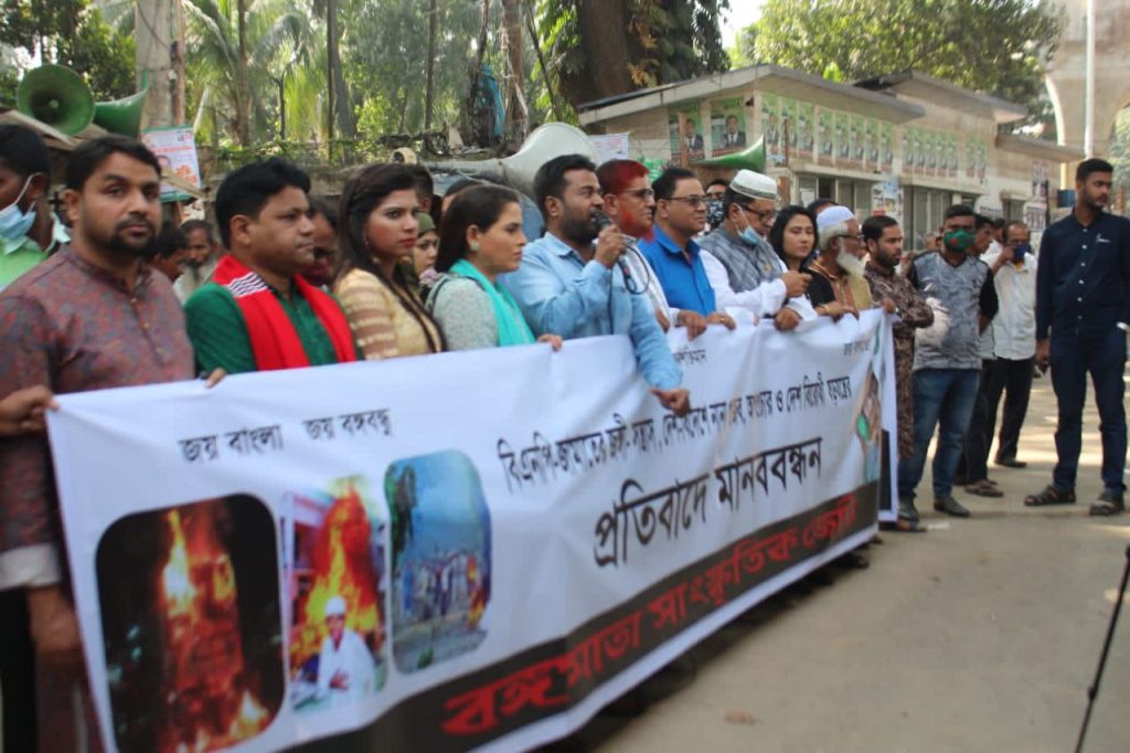 জঙ্গি ও আগুন সন্ত্রাসী দল বিএনপির দেশ-বিদেশে নানা গুজব, অপপ্রচার ও দেশ বিরোধী ষড়যন্ত্রের প্রতিবাদ মানববন্ধন করেন বঙ্গমাতা সাংস্কৃতি জোট। বাংলাদেশ জাতীয় প্রেসক্লাবের সামনে সকাল ১১ টায় প্রতিবাদ সভা ও মানববন্ধন পালন করে বঙ্গমাতা সাংস্কৃতি জোট। এ সময় প্রধান অতিথি হিসেবে উপস্থিত ছিলেন বঙ্গমাতা সাংস্কৃতি জোটের প্রতিষ্ঠাতা ও সভাপতি বিশিষ্ট চলচ্চিত্র প্রযোজক, গীতিকার ও সুরকার শেখ শাহ আলম। বিশেষ অতিথি হিসেবে ছিলেন, বঙ্গমাতা সাংস্কৃতি জোটের সাধারণ সম্পাদক, বিশিষ্ট ব্যবসায়ী ও চলচ্চিত্র প্রযোজক, অনুপ কুমার বড়ুয়া, সহ-সভাপতি মজিবুর রহমান, যুগ্ন সাধারন রোকনউদ্দিন পাঠান, বিশেষ সম্মানিত ব্যক্তি হিসেবে উপস্থিত ছিলেন কেন্দ্রীয় কার্যনির্বাহী কমিটির সদস্য মোঃ নাছির উদ্দিন, সাংগঠনিক সম্পাদক অসিম কুমার ঘোষ, এস বিজয়, সাংগঠনিক সম্পাদক আলম সরকার, সাহেলা আক্তার, অর্থ সম্পাদক আরেফিন আলভী, সাংস্কৃতি সম্পাদক লাভলী সেখ, সহ সংগঠনের অন্যান্য নেতৃবৃন্দ প্রমুখ।