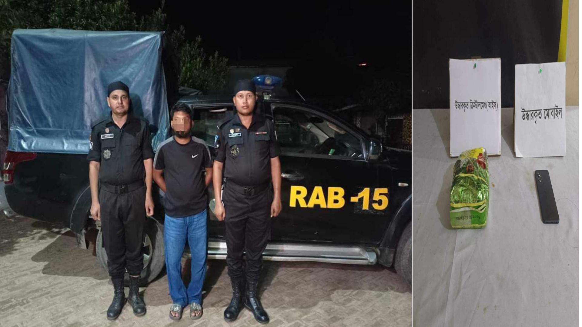 পরবর্তীতে উপস্থিত সাক্ষীদের সম্মুখে আটককৃত ব্যক্তির দেহ ও তার হেফাজতে থাকা শপিং ব্যাগ তল্লাশী করে ৯৪০ গ্রাম ক্রিস্টালমেথ (আইস) উদ্ধারসহ ০১টি এন্ড্রয়েড ফোন জব্দ করা হয় বলে জানা যায়।