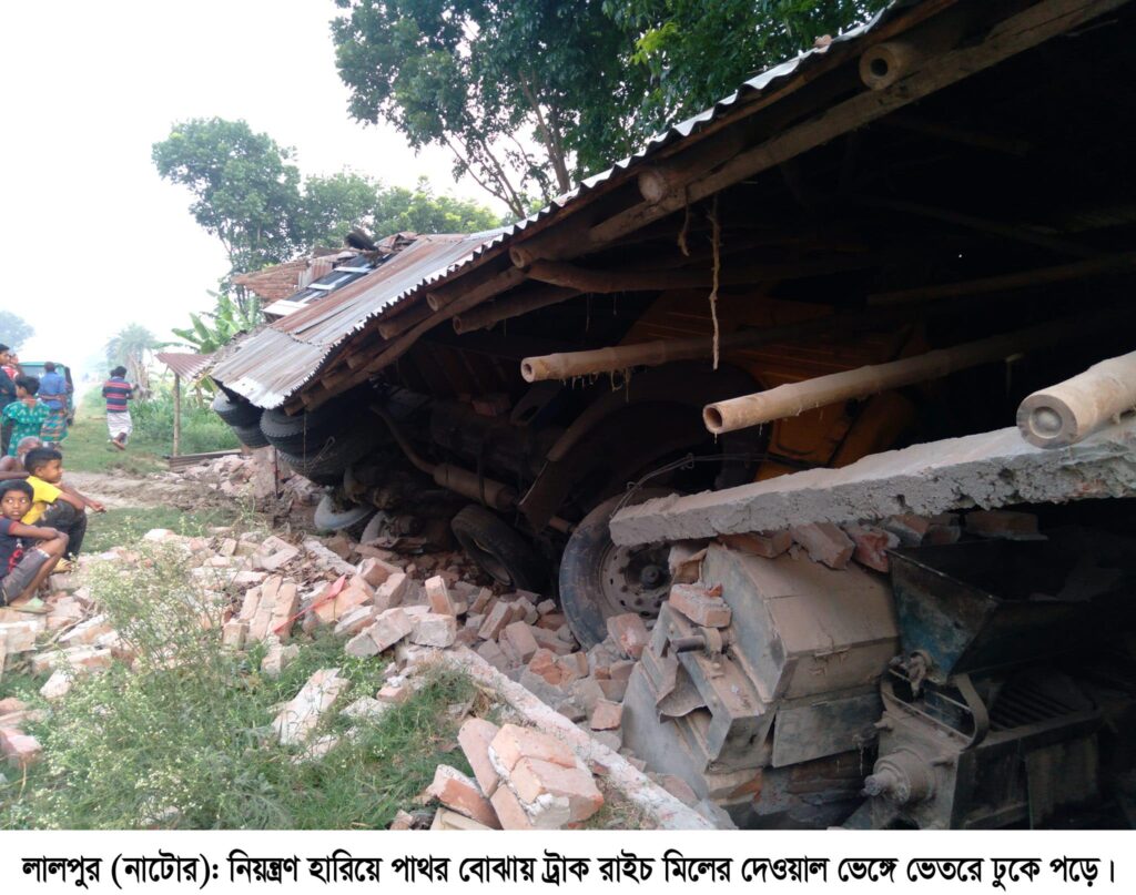 নাটোরের লালপুর উপজেলার লালপুর-বাঘা আঞ্চলিক মহাসড়কের উধনপাড়া এলাকায় একটি পাথর বোঝায় ট্রাক নিয়ন্ত্রণ হারিয়ে সড়কের পাশের মেসার্স তুহিন রাইচ মিল নামের একটি চালকলের দেয়াল ভেঙ্গে ভেতরে ঢুকে পড়ে। এতে প্রায় ১০ লক্ষাধিক টাকার ক্ষতি হয়েছে। এসময় ট্রাকের ড্রাইভার হেলপার আহত হয়েছেন বলে জানান স্থানীয়রা। তাাদের পরিচয় পাওয়া যায়নি। বৃহস্পতিবার ভোর ৪টার দিকে এ দুর্ঘটনা ঘটে।