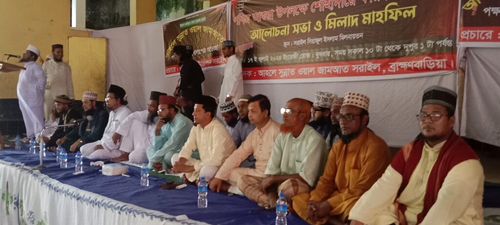 ব্রাহ্মণবাড়িয়া সরাইলে আজ বুধবার ১৭ জুলাই ২০২৪ ইং, সরাইল সিরাজুল ইসলাম মিলনাতনে পবিত্র আশুরা উপলক্ষে আলোচনা সভা ও মিলাদ মাহফিল অনুষ্ঠিত হয়েছে। উক্ত অনুষ্ঠানে সরাইল উপজেলার বিভিন্ন এলাকার আহলে সুন্নাত ওয়াল জামাতের অনুসারীরা অনুষ্ঠানের যোগদান করেন, অনুষ্ঠানটি সকাল দশটায় আরম্ভ হয়ে দুপুর ১ টার সময় সমাপ্ত ঘোষণা করা হয়।