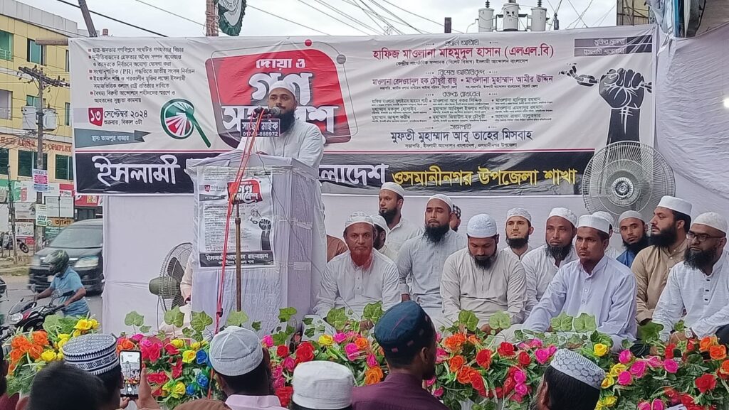 ওসমানীনগর বালাগঞ্জ প্রতিনিধিঃ সিলেটের ওসমানীনগরে ‘বাংলাদেশ ইসলামী আন্দোলন’ ওসমানীনগর উপজেলা শাখার গন সমাবেশ অনুষ্ঠিত হয়েছে। শুক্রবার বিকালে উপজেলার তাজপুর বাজারে এই সমাবেশে ছাত্র-জনতার গণবিপ্লবে সংঘটিত গণহত্যার বিচার, দুর্নীতিবাজদের গ্রেফতার, অবৈধ সম্পদ বাজেয়াপ্ত ও তাদেরকে নির্বাচনে অযোগ্য ঘোষণা করা, সংখ্যানুপাতিক (চজ) পদ্ধতিতে জাতীয় সংসদ নির্বাচন, ইহকালীন শান্তি ও পরকালীন মুক্তির লক্ষ্যে ইসলামী সমাজভিত্তিক কল্যাণ রাষ্ট্র প্রতিষ্ঠার দাবিতে এই সমাবেশ অনুষ্ঠি হয়।