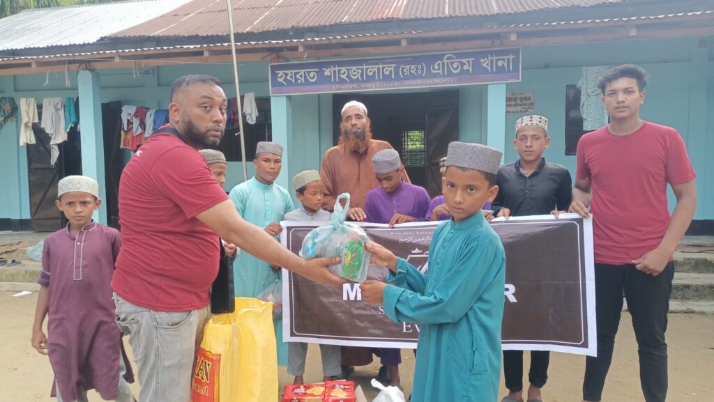 সোমবার দুপুরে উপজেলার তাজপুর কাশিপাড়া গ্রামে ও হজরত শাহজালাল (রঃ) এতিমখানায় পৃথকভাবে ২৫০ জন মানুষের মাঝে খাবার এবং ১৫০ টি পরিবারের মাঝে ত্রাণ সামগ্রী বিতরণ করা হয়।