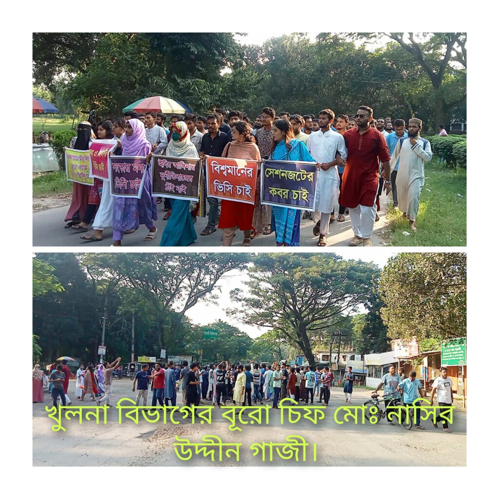 শুক্রবার (২০ সেপ্টেম্বর) বিকেল ৪টায় বিশ্ববিদ্যালয়ের বটতলা থেকে বিক্ষোভ মিছিল শুরু করেন শিক্ষার্থীরা। পরে বিক্ষোভ মিছিল নিয়ে ক্যাম্পাসে বিভিন্ন সড়ক প্রদক্ষিণ শেষে প্রধান ফটক-সংলগ্ন খুলনা-কুষ্টিয়া মহাসড়কে আসেন। এরপর বিকেল সাড়ে ৪টা থেকে আধাঘণ্টা মহাসড়ক অবরোধ করে রাখেন তারা। এ সময় তারা বিভিন্ন স্লোগান দিতে থাকেন।শিক্ষার্থীরা ‘সবাই যখন স্বর্গে ইবি কেন মর্গে’, ‘ভিসি ভিসি ভিসি চাই, ইবিতে ভিসি চাই’, ‘ভিসি নিয়ে নয় ছয়, আর নয় আর নয়’, ‘ঢাবি, রাবি ভিসি পায়, ইবি কেন পিছিয়ে রয়’, ‘সংস্কারমনা ভিসি চাই, দুর্নীতিমুক্ত ভিসি চাই’, ‘সৎ-সাহসী ভিসি চাই, সেশনজটর কবর চাই’ ইত্যাদি স্লোগান দেন।