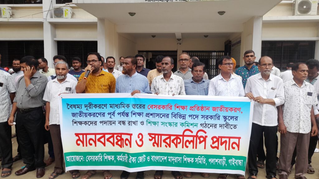 মিলন মন্ডল,পলাশবাড়ী(গাইবান্ধা)প্রতিনিধিঃগাইবান্ধা জেলার পলাশবাড়ীতে ২৪ সেপ্টেম্বর সকাল ১১ ঘটিকায় উপজেলা চত্বরে বৈষম্য দূরীকরণে মাধ্যমিক স্তরের বেসরকারি শিক্ষা প্রতিষ্ঠান জাতীয়করণ, জাতীয় করণের পূর্ব পর্যন্ত শিক্ষা প্রশাসনের বিভিন্ন পদে সরকারি স্কুলের শিক্ষকদের পদায়ন বন্ধ রাখা ও শিক্ষা সংস্কার কমিশন গঠনের দাবীতে উপজেলার সকল মাধ্যমিক বিদ্যালয় ও মাদ্রাসার শিক্ষকদের এক বিশাল মানব বন্ধন উপজেলা পরিষদ চত্ত্বরে অনুষ্ঠিত হয়।