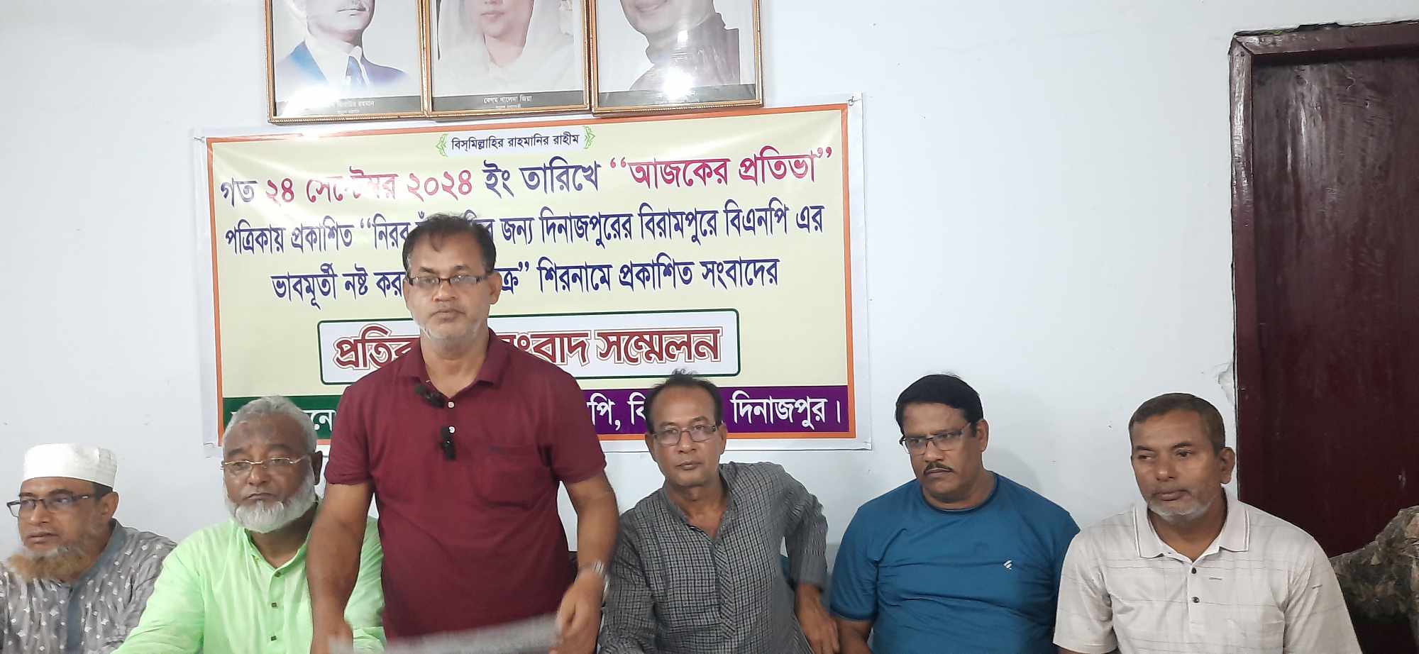 সোমবার (৩০ শে সেপ্টেম্বর) সন্ধ্যা ৬টায় বিরামপুর বিএনপির থানা কার্যালয়ে লিখিত বক্তব্য পাঠ করেন পৌর বিএনপির সাধারণ সম্পাদক রেজাউল করিম রেজু এ সময় উপস্থিত ছিলেন উপজেলা বিএনপির সভাপতি মিঞা মোঃ শফিকুল আলম মামুন, সাধারণ সম্পাদক মঞ্জুর এলাহী চৌধুরী রুবেল, সাংগঠনিক সম্পাদক নুর আলম,পৌর বিএনপির সভাপতি হুমায়ুন কবির, সাধারণ সম্পাদক রেজাউল করিম রেজু, প্রাক্তন কমিশনার হুমায়ন করিব মিলন সহ আরো অনেকে। দিনাজপুর থেকে প্রকাশিত আজকের প্রতিভা পত্রিকায় নীরব চাঁদাবাজি জন্য দিনাজপুরের বিরামপুর বিএনপির ভাব মূর্তি নষ্ট করছে একটি চক্র শিরোনামে প্রকাশিত সংবাদটি নিন্দা জানিয়েছেন বিরামপুর পৌর ও উপজেলা বিএনপি। বক্তারা সাংবাদিকগণকে জানান সঠিক তদন্ত করে বস্তুনিষ্ঠ সংবাদ প্রকাশের জন্য স্থানীয় সাংবাদিকদের প্রতি উদাত্ব আহবান জানান।