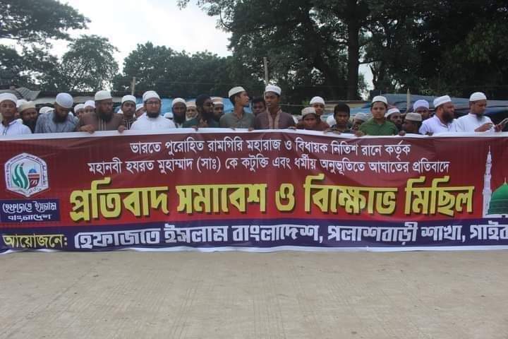 মিলন মন্ডল, পলাশবাড়ী (গাইবান্ধা)প্রতিনিধি: ভারতে পুরোহিত রামগিরি মহারাজ ও বিধায়ক নিতিশ রানে কর্তৃক মহানবী হযরত মুহাম্মদ (সাঃ) কে কটুক্তি এবং ধর্মীয় অনুভূতিতে আঘাতের প্রতিবাদে পলাশবাড়ীতে প্রতিবাদ সমাবেশ ও বিক্ষোভ মিছিল অনুষ্ঠিত হয়েছে।