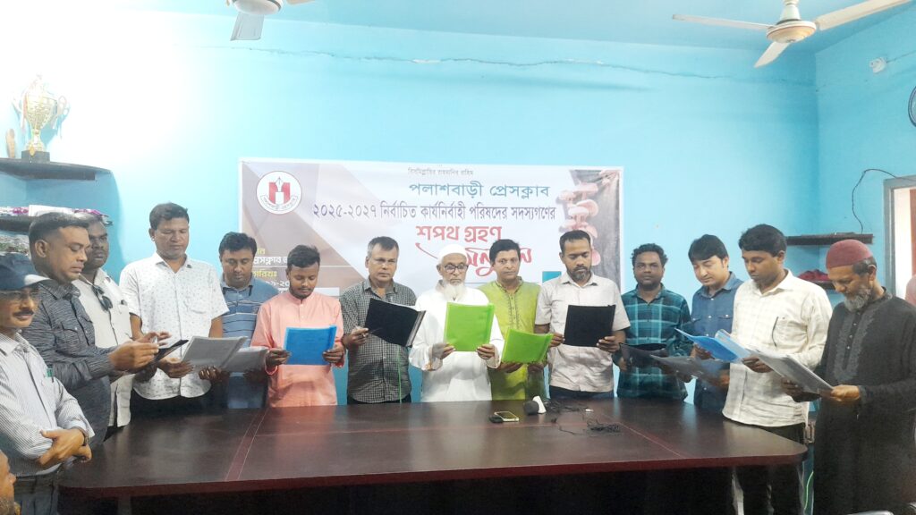 উল্লেখ্য, গত ২১ অক্টোবর পলাশবাড়ী প্রেসক্লাবে ২০২৫-২০২৭ ত্রি-বার্ষিক নির্বাচন অনুষ্ঠিত হয়। এতে শাহ আলম সরকার সভাপতি, পাপুল সরকার সাধারণ সম্পাদক, আব্দুল মতিন সাংগঠনিক সম্পাদক, আশরাফুজ্জামান সরকার সহ-সভাপতি, হাসিবুর রহমান স্বপন যুগ্ম সাধারণ সম্পাদক, হামিদুল হক মন্ডল কোষাধ্যক্ষ, দপ্তর সম্পাদক মিলন মন্ডল, সাংস্কৃতিক ও সাহিত্য বিষয়ক সম্পাদক বিদুষ রায়, ধর্মীয় সম্পাদক আশরাফুজ্জামান শাহিন, মতিয়ার রহমান লাভলু ও এ্যাড. আবেদুর রহমান সবুজ কার্যকরী সদস্য নির্বাচত হয়।