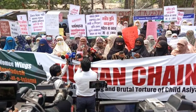 অগ্নিশিখা প্রতিবেদক: শিশু আছিয়াকে পাশবিক নির্যাতনের মাধ্যমে হত্যার প্রতিবাদ ও ৫ দাবিতে মানববন্ধন করেছে জামায়াতে ইসলামীর মহিলা বিভাগ।