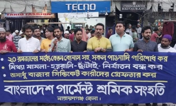 সভাপতি বক্তব্য আব্দুল্লাহ আল মামুন বলেন, অবিলম্বে ২০ রমজানের পূর্বে শ্রমিকদের সকল বকেয়া পাওনা পাওনা মার্চ মাসের পূর্ণ বেতন সম্পূর্ণ বোনাস প্রদান করিতে হবে। গার্মেন্ট মালিকরা যদি বোনাস বেতন নিয়ে কোন তালবাহানা করে গার্মেন্টস শ্রমিকদের নিয়ে আন্দোলন গড়ে তুলা হবে।