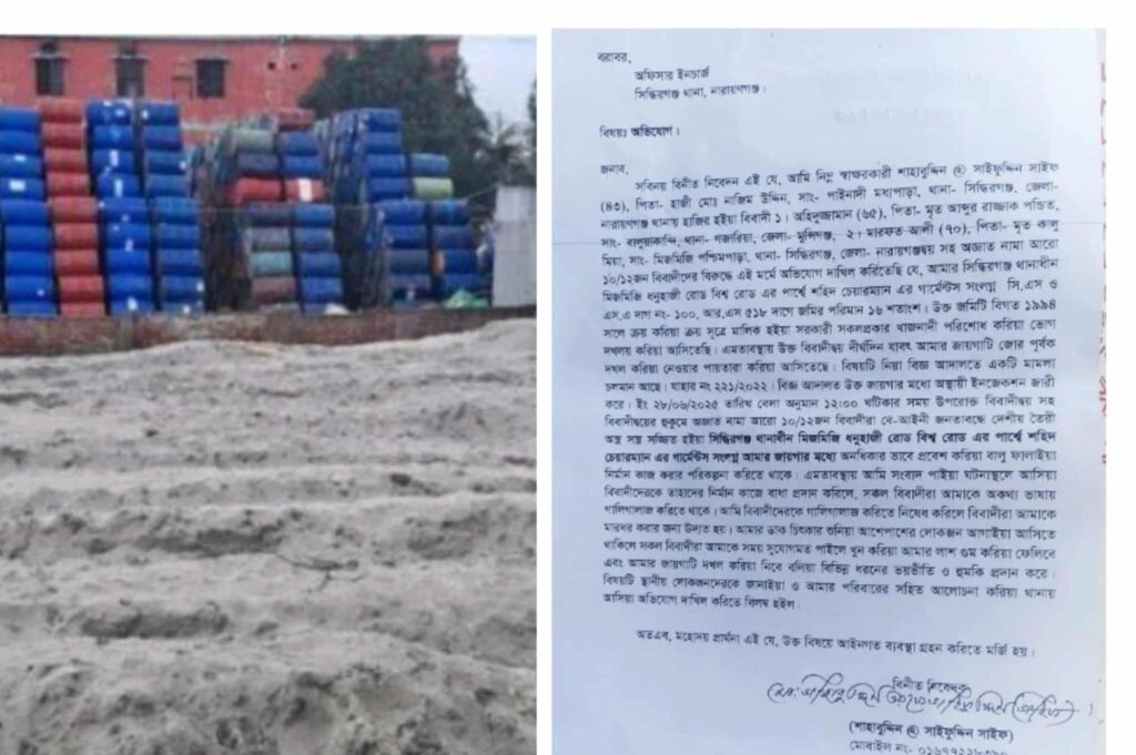 নারায়ণগঞ্জের সিদ্ধিরগঞ্জে মিজমিজি ধনু হাজী রোড এলাকায় আদালতের দেয়া অবস্থায়ী নিষেধাজ্ঞা অমান্য করে জোরপূর্বক অহিদুজ্জামান গংরা জমি দখল সহ বালু ভরাটের পায়তারা করছে। এ বিষয়ে ভুক্তভোগী শাহাবুদ্দীন ওরফে সাইফউদ্দিন সাইফ বাদি হয়ে সিদ্ধিরগঞ্জ থানায় একটি অভিযোগ দায়ের করেন। অভিযোগ সূত্রে জানা গেছে, উক্ত থানাধীন মিজমিজি ধনু হাজী রোড সংলগ্ন এলাকায় বিগত ১৯৯৪ ইং সালে খরিদ করে বাদি পক্ষ । যাহার সিএস ও এস এ দাগ নং- ১০০, আর এস দাগ নং- ৫১৮। খরিদ করার পর জমির সকল প্রকার খাজনাদি ও নামজারি করে ভোগ দখল করে আসছে বাদি পক্ষ । এমতাবস্থায় বিবাদীরা অর্থাৎ অহিদুজ্জামান ও মারফত আলী সহ অজ্ঞাতনামা বেশ কয়েকজন ভাড়াটে চাঁদাবাজ ভূমিদস্যু ও সন্ত্রাসীরা উক্ত জমিটি দখলের পায়তারা সহ বালু ভরাটের কাজ করছে। এর আগে বিবাদীরা এই জমি দখলের চেষ্টা করার সময় নারায়ণগঞ্জ জেলার একটি আদালতে মামলা দায়ের করেন সাইফ গংরা। ঐ মামলায় বিজ্ঞ আদালত অস্থায়ী নিষেধাজ্ঞা জারি করেন। আদালতের দেয়া নিষেধাজ্ঞা অমান্য করে তারা এখন নালিশা জমিতে বালু ভরাটের কাজ করছে।