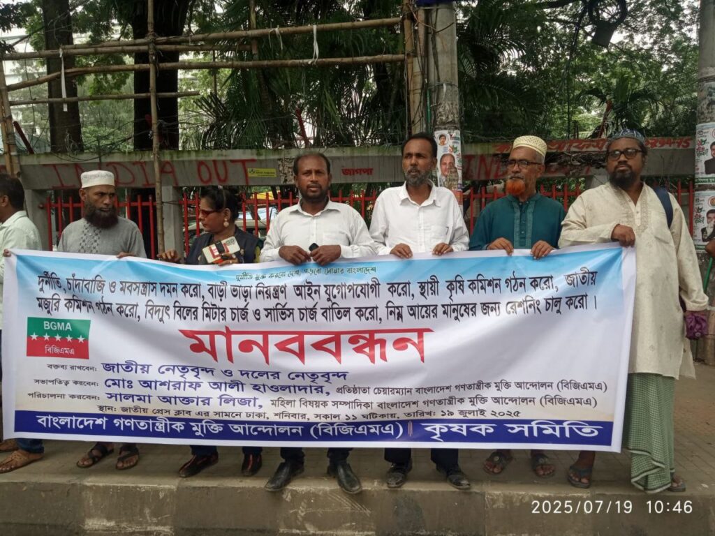 ১৯ জুলাই ২০২৫ শনিবার সকাল ১১ টায় জাতীয় প্রেস ক্লাব এর সামনে বাংলাদেশ গণতান্ত্রীক মুক্তি আন্দোলন (বিজিএমএ) ও কৃষক সমিতির যৌথ উদ্যোগে দুর্নীতি, চাঁদাবাজি ও মবসন্ত্রাস দমন করো, বাড়ী ভাড়া নিয়ন্ত্রণ আইন যুগোপযোগী, স্থায়ী কৃষি কমিশন গঠন, জাতীয় মজুরি কমিশন গঠন, মোবাইলে ইন্টারনেটে ডাটা ও মিনিটের মেয়াদ বাতিল, বিদ্যুৎ বিলের মিটার চার্জ ও সার্ভিস চার্জ বাতিল, নিম্ন আয়ের মানুষের জন্য রেশনিং চালু করার দাবিতে মানববন্ধন করা হয়।