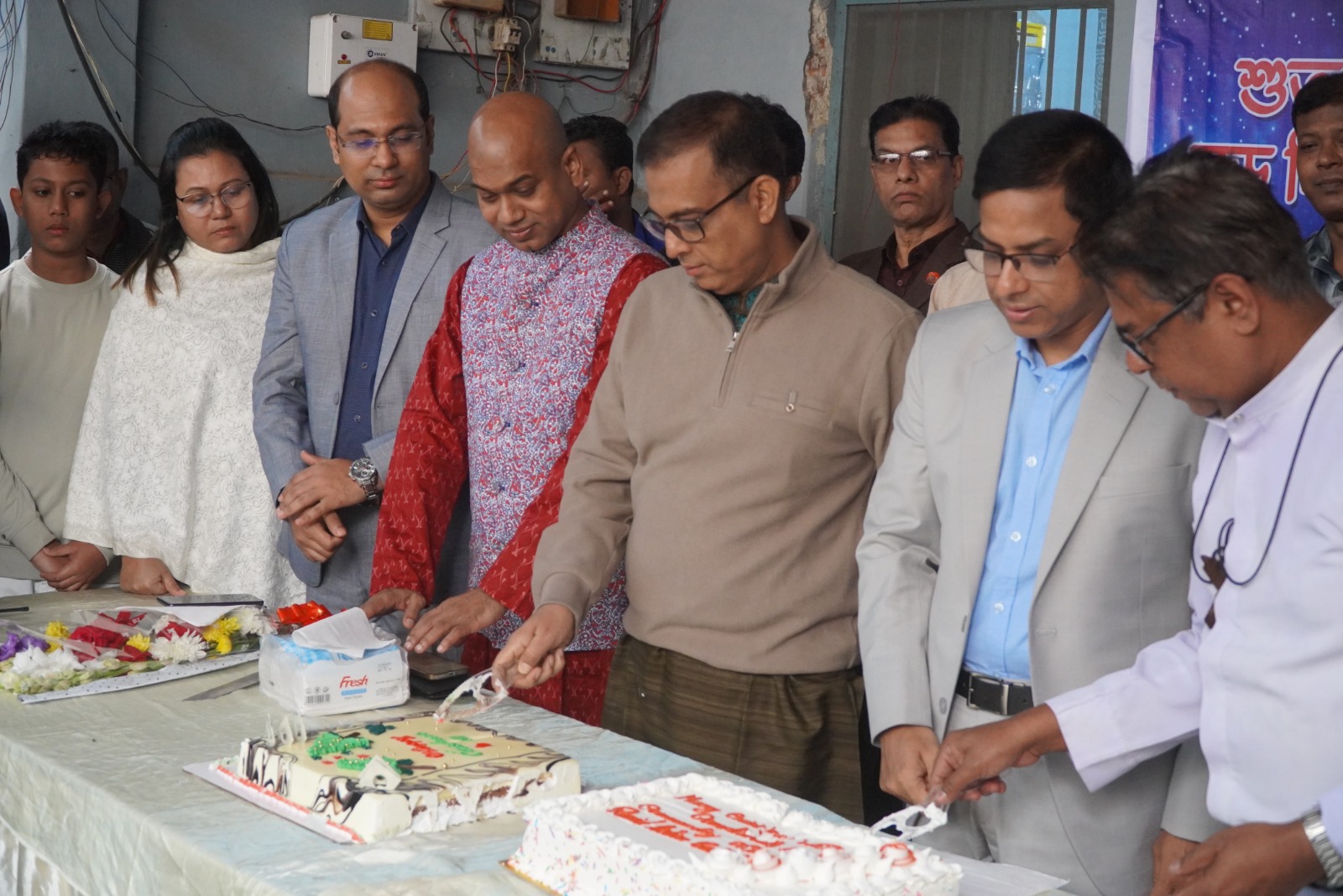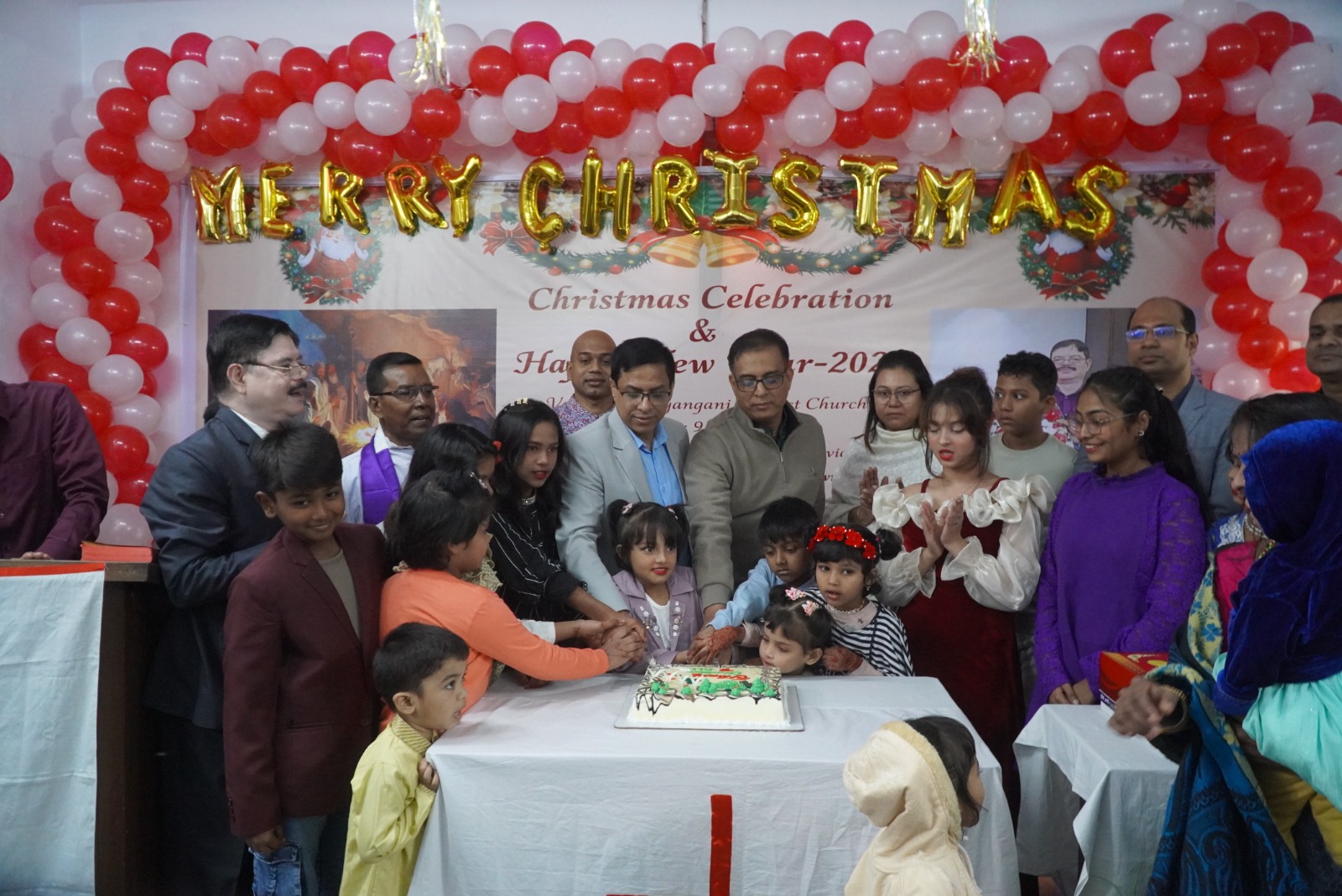 অতিথিদের সাথে নিয়ে বড় দিনের কেক কাটছেন। ছবি: দৈনিক অগ্নিশিখা