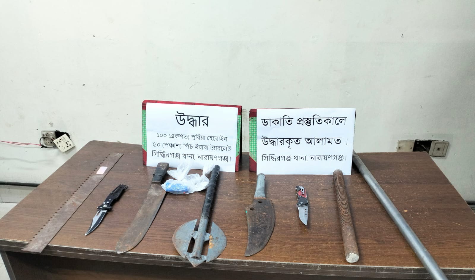 গ্রেফতারকৃতদের হেফাজত থেকে উদ্ধার করা হয়— দেশীয় তৈরি ধারালো চাপাতি, সুইচ গিয়ার, ছুরি, কুড়াল, করাত, লোহার রড, এসএস পাইপসহ ডাকাতির বিভিন্ন সরঞ্জাম। এছাড়া উদ্ধার করা হয় ১০০ পুরিয়া হেরোইন ও ৫০ পিস ইয়াবা ট্যাবলেট।