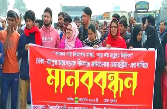 পীরগঞ্জে ওভার ব্রীজ নির্মানের দাবীতে মানববন্ধন মহাসড়ক অবরোধ