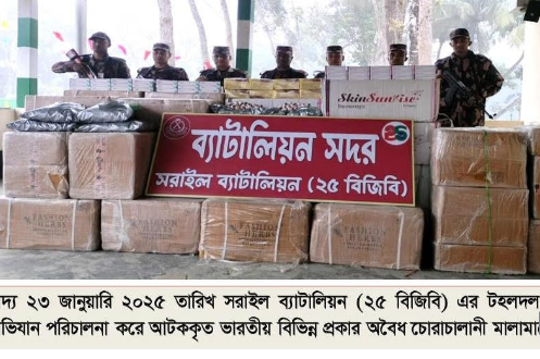 সরাইল ব্যাটালিয়ন ২৫ বিজিবির অভিযানে ভারতীয় চোরাচালানীর প্রায় ৫১ লক্ষ টাকার মালামাল আটক